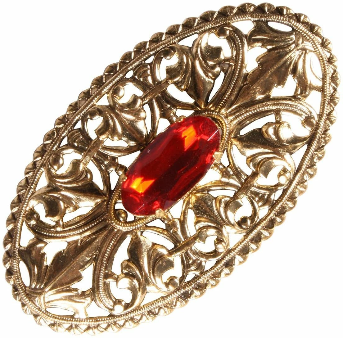 Goudkleurige ovale metalen baretspeld met in het midden een rode steen.