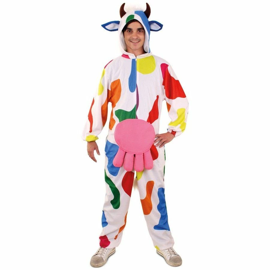 Origineel bonte koeien pak Wietske unisex omvat de jumpsuit met capuchon. Het koeien kostuum is van pluche gemaakt