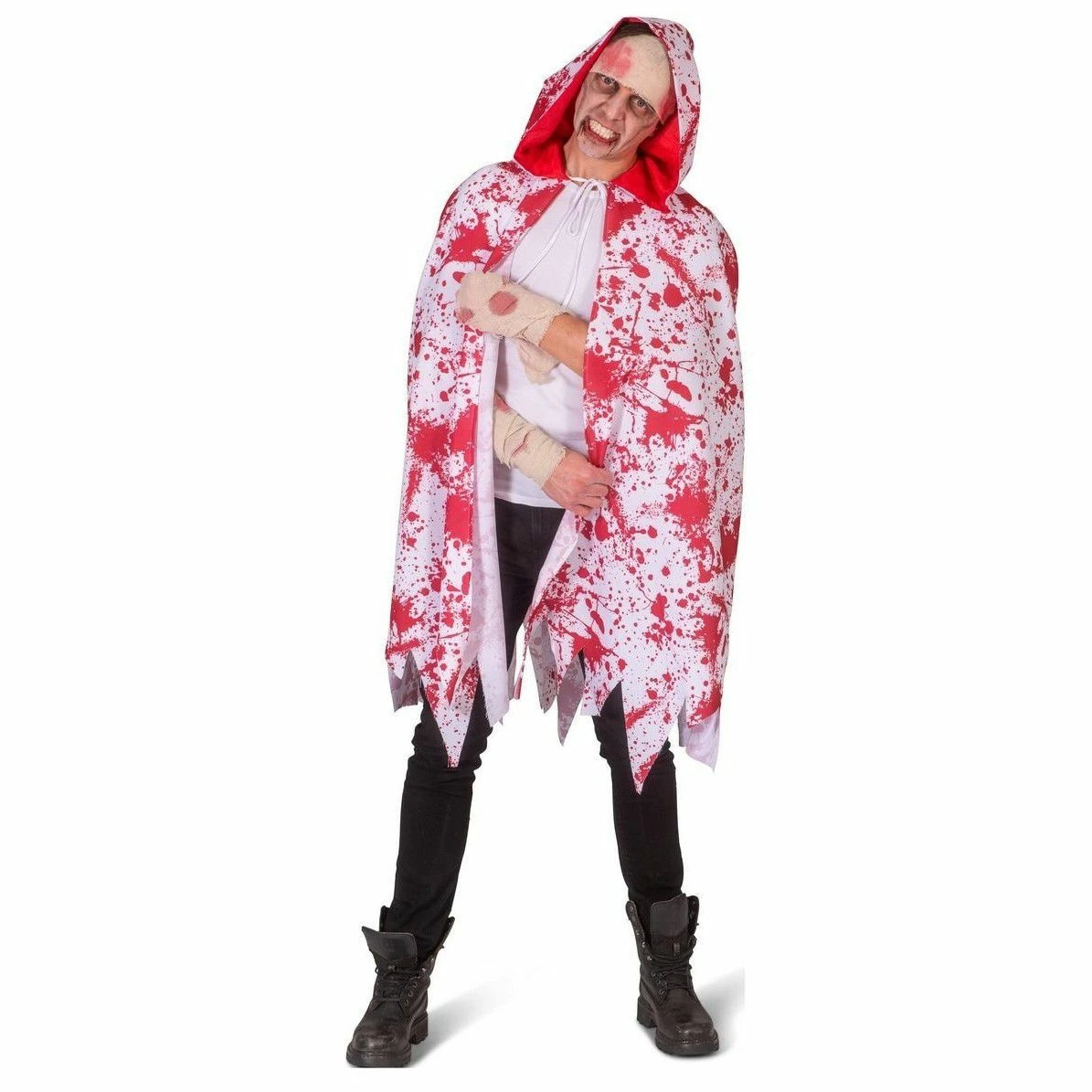 Mooie halflange witte cape met bloedvlekken met capuchon.