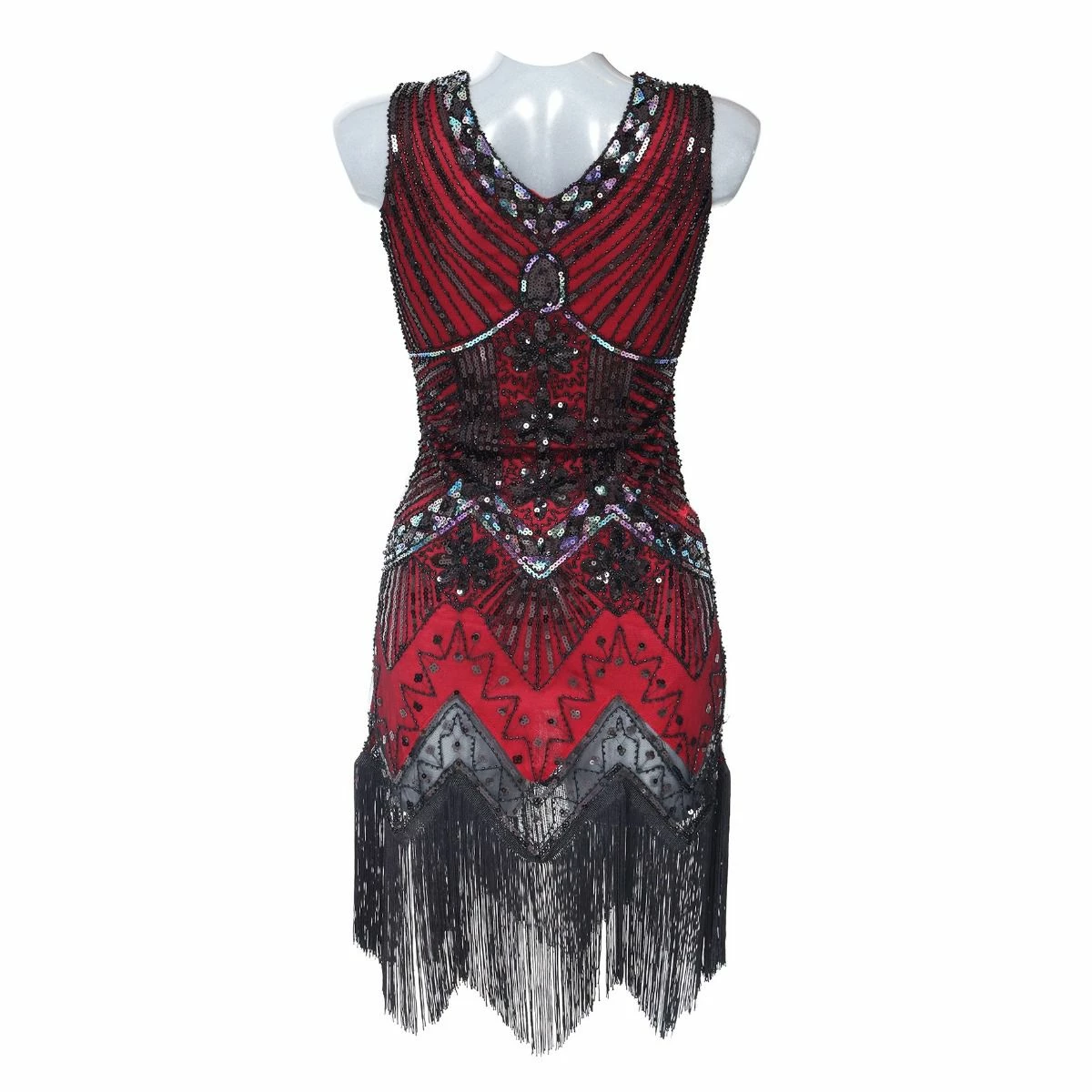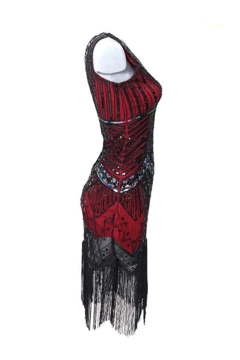 Luxe jaren 20 jurk in de kleur bordeaux rood met goud.