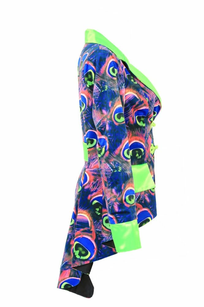Prachtige luxe jas in pauw motief gecombineerd met neon groen.