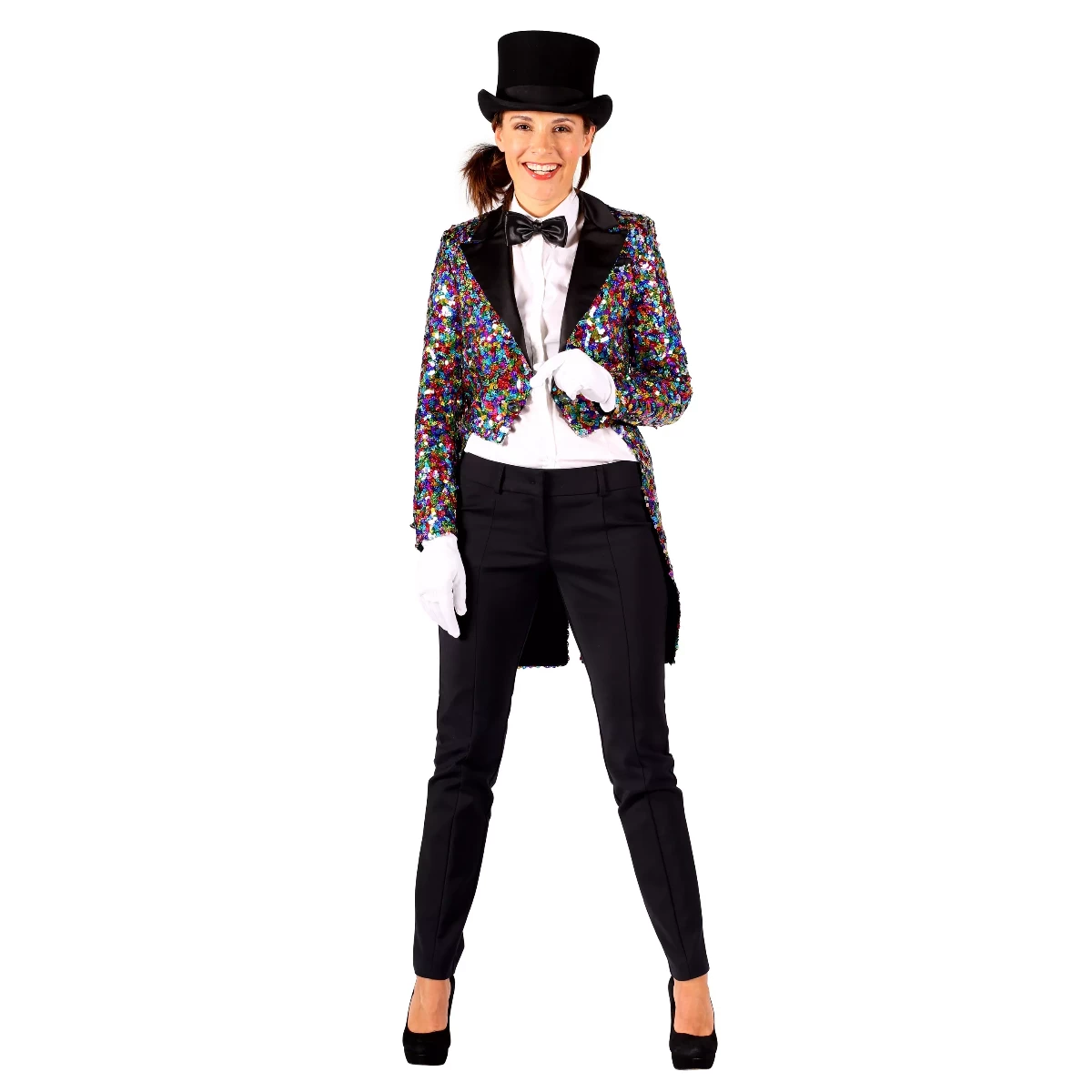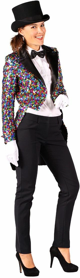 Deze jas is zwart met daarop verschillende kleuren pailletten