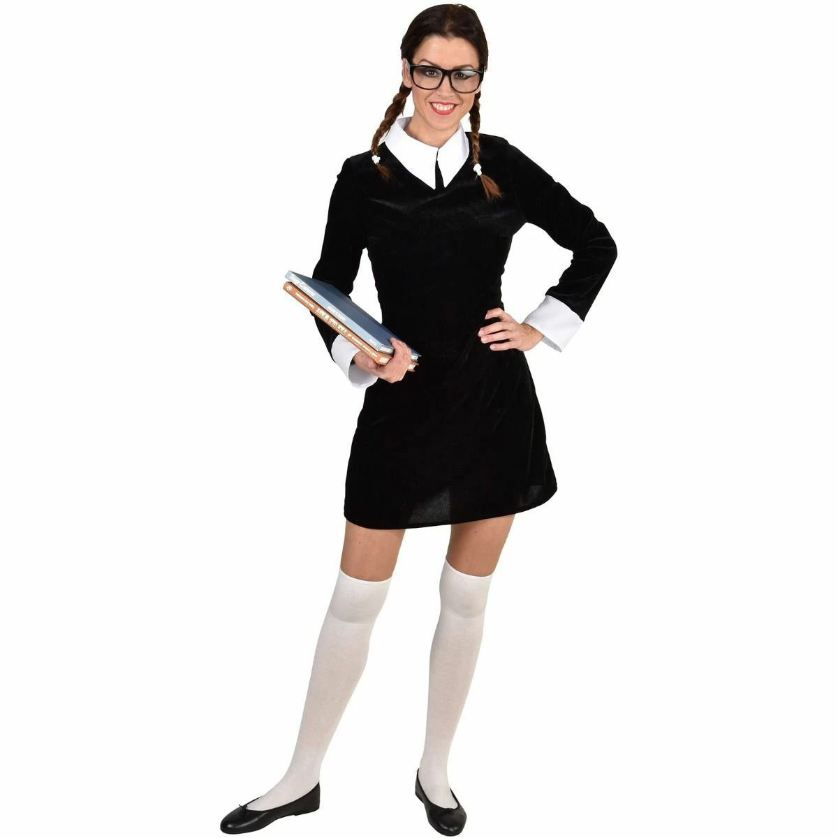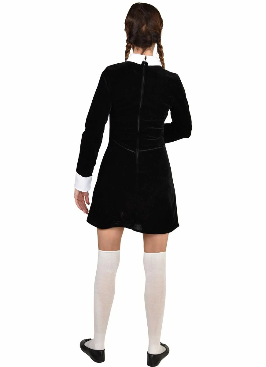 Zwart jurkje met witte kraag met lange mouwen.