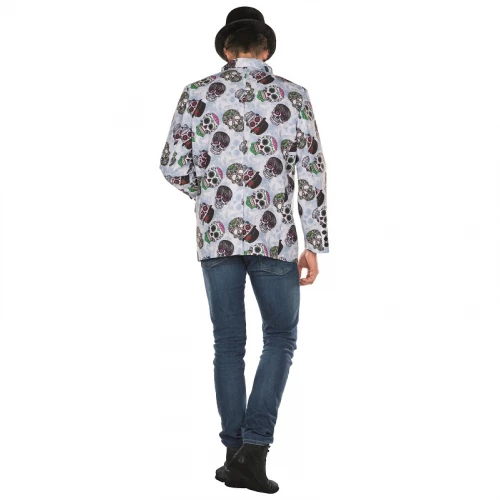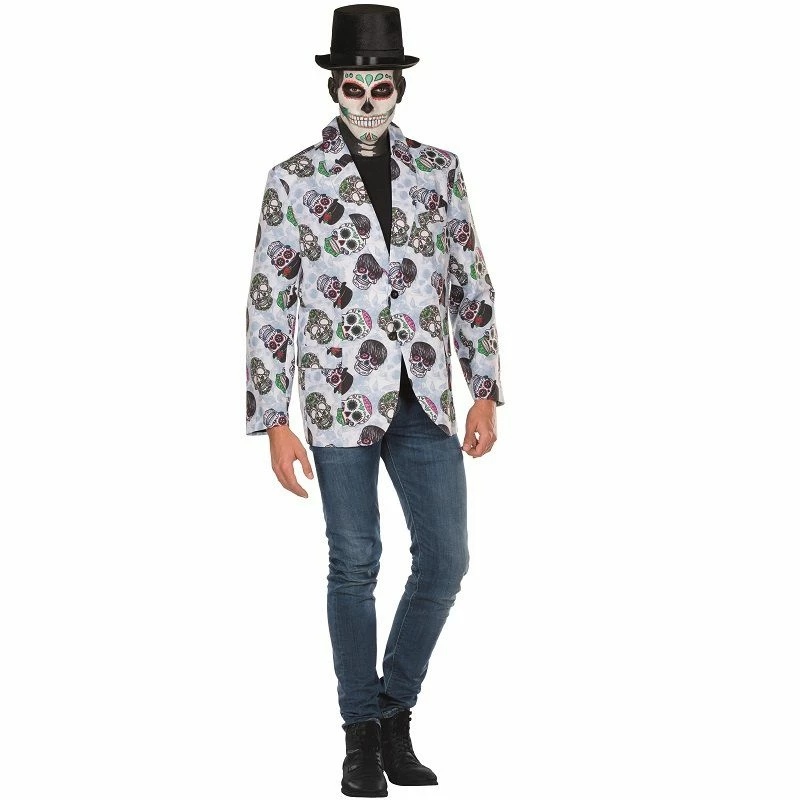 Lichtblauwe dessin heren jas, bedrukt met kleurrijke doodshoofden.