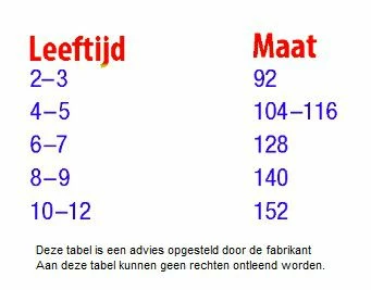 | Maat | S (3-4 jaar), M (5-6 jaar), L (7-8 jaar) |