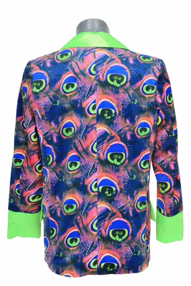 Luxe zwarte heren jas in pauw motief gecombineerd met neon groen.