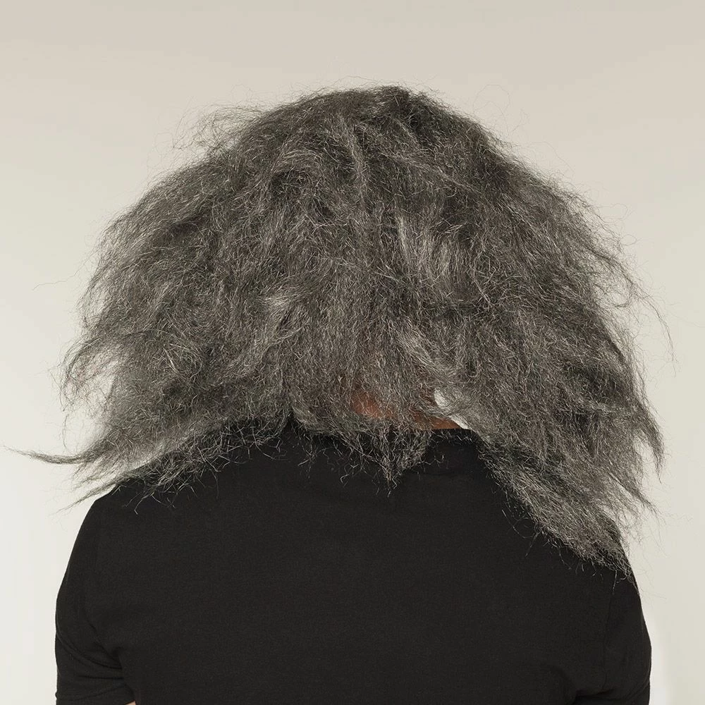 Dit masker is gemaakt van latex en heeft grijze lange haren.