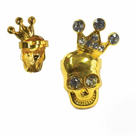 Een mooie goudkleurige ring met doodshoofd en kroon, met ingelegde steentjes.