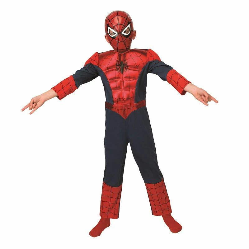 Blauw met rode gespierde, glanzende jumpsuit, voor kinderen, met een zwarte spinnen print op de borst en web patroon op de rode stukken.
