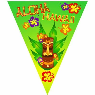 Vlaggenlijn met de tekst : ‘ ALOHA HAWAII ‘ en een totempaal